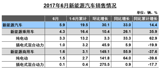 6月,新能源汽車產(chǎn)銷分別完成6.5萬輛和5.9萬輛,同比分別增長(zhǎng)43.4%和33.0%,環(huán)比分別增長(zhǎng)25.9%和30.1%;上半年,新能源汽車產(chǎn)銷分別完成21.2萬輛和19.5萬輛,比上年同期分別增長(zhǎng)19.7%和14.4%。