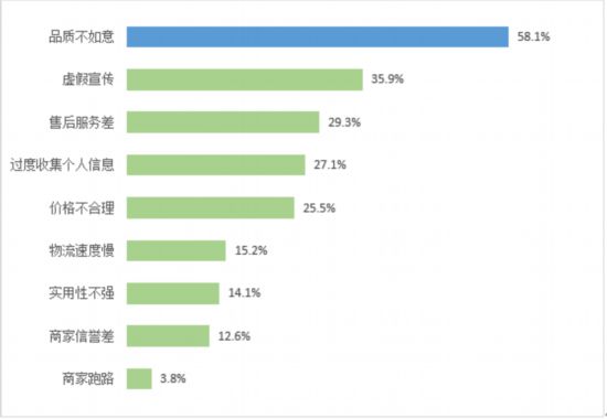 56.5%的受訪者表示對當(dāng)前的消費(fèi)環(huán)境比較放心或非常放心。58.1%的受訪者對當(dāng)前商品/服務(wù)不滿意的首要原因是“品質(zhì)不如意”,“虛假宣傳”也是受訪者反映較為集中的不滿意原因,占比超過35.9%。“售后服務(wù)差”(29.3%)、“過度收集個人信息”(27.1%)等方面也是造成受訪者對現(xiàn)有消費(fèi)商品和服務(wù)不滿意的重要原因。