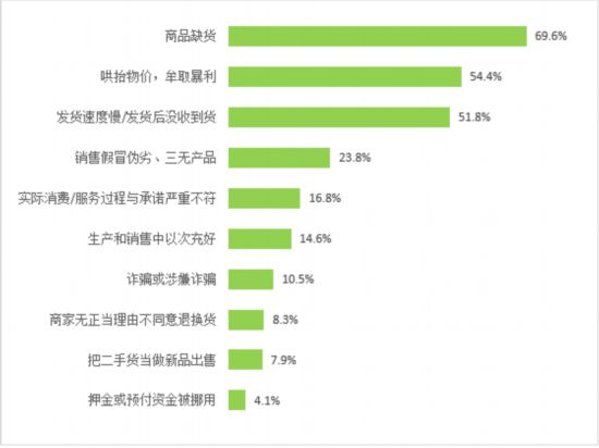 疫情期間,69.6%的受訪者主要遇到“商品缺貨”的消費(fèi)問題;54.4%的受訪者遇到“哄抬物價,牟取暴利”,51.8%的受訪者遇到“發(fā)貨速度慢/發(fā)貨后沒收到貨”。