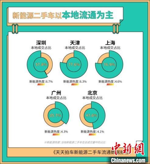 不過(guò),在新能源二手車(chē)流通方面,本地化、區(qū)域化的交易目前仍是主要的流通方式。深圳的本地成交占比為57.8%、天津?yàn)?7.6%、上海為76.9%,從整體來(lái)看,本地成交的新能源二手車(chē)在天天拍車(chē)平臺(tái)的占比為63%,大部分的新能源二手車(chē)被本地買(mǎi)家買(mǎi)走。