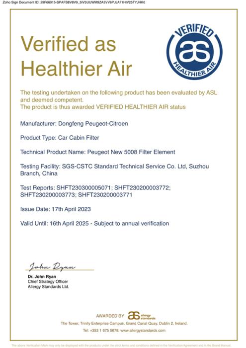 新5008斬獲ASL(Allergy Standards Limited)健康空氣認證