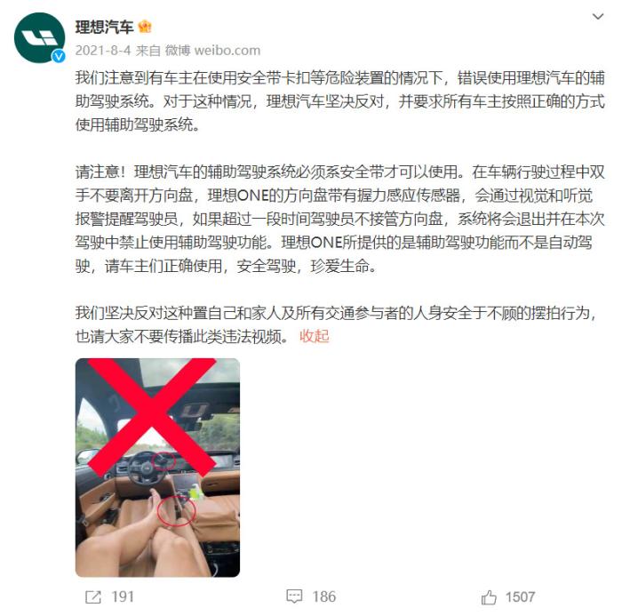 針對上述行為,理想汽車在2021年曾通過微博回應稱,“理想汽車的輔助駕駛系統(tǒng)必須系安全帶才可以使用。在車輛行駛過程中雙手不要離開方向盤,理想ONE的方向盤帶有握力感應傳感器,會通過視覺和聽覺報警提醒駕駛員,如果超過一段時間駕駛員不接管方向盤,系統(tǒng)將會退出并在本次駕駛中禁止使用輔助駕駛功能。”