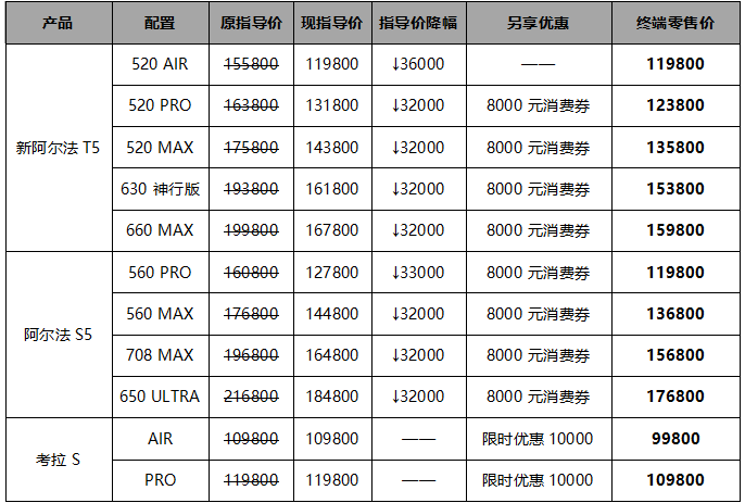 即日起,極狐對新阿爾法T5和阿爾法S5官方指導(dǎo)價(jià)進(jìn)行下調(diào),官方降價(jià)32000元,還可另享8000元消費(fèi)券,如此一來,5系“雙子星”終端零售價(jià)最低僅需11.98萬元;考拉S限時(shí)優(yōu)惠增至10000元,終端零售價(jià)直接下探到了9.98萬元起。