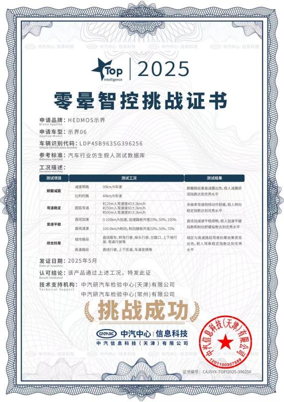 近期,在行業(yè)首次的暈動(dòng)仿生假人零暈智控挑戰(zhàn)中,示界06展現(xiàn)了優(yōu)異的駕控表現(xiàn)。中國(guó)汽車(chē)研究中心有限公司高級(jí)工程師趙博文在發(fā)布會(huì)現(xiàn)場(chǎng)公布測(cè)試數(shù)據(jù)時(shí)指出:“通過(guò)精準(zhǔn)的電機(jī)扭矩動(dòng)態(tài)分配、法系底盤(pán)調(diào)?;?,以及搭載的‘零暈智控’技術(shù)體系,示界06在六維駕控測(cè)試中表現(xiàn)出行業(yè)優(yōu)秀水平?!睖y(cè)試結(jié)果顯示,示界06完美實(shí)現(xiàn)了“6不”卓越體驗(yàn):簸路不顛、彎道不飄、加速不竄、減速不抖、駕乘不暈、長(zhǎng)途不累,為行業(yè)樹(shù)立了駕乘舒適新標(biāo)桿。
