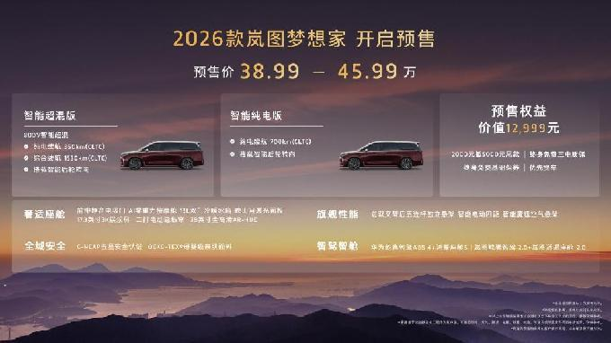 8月29日,第二十八屆成都國(guó)際汽車(chē)展覽會(huì)盛大開(kāi)幕。全面煥新升級(jí)的“新時(shí)代旗艦MPV”2026款嵐圖夢(mèng)想家預(yù)售亮相。本次新車(chē)共推出智能超混版和智能純電版兩個(gè)動(dòng)力版本,預(yù)售價(jià)為38.99萬(wàn)-45.99萬(wàn),同步推出了價(jià)值超萬(wàn)元的多項(xiàng)重磅權(quán)益,包括2000元抵5000元尾款的膨脹金,終身免費(fèi)三電質(zhì)保、終身免費(fèi)基礎(chǔ)保養(yǎng)和優(yōu)先交付提車(chē)。9月1日起,2026款嵐圖夢(mèng)想家展車(chē)、試駕車(chē)將陸續(xù)到店,消費(fèi)者可以進(jìn)店親自體驗(yàn)新車(chē)的獨(dú)特魅力。