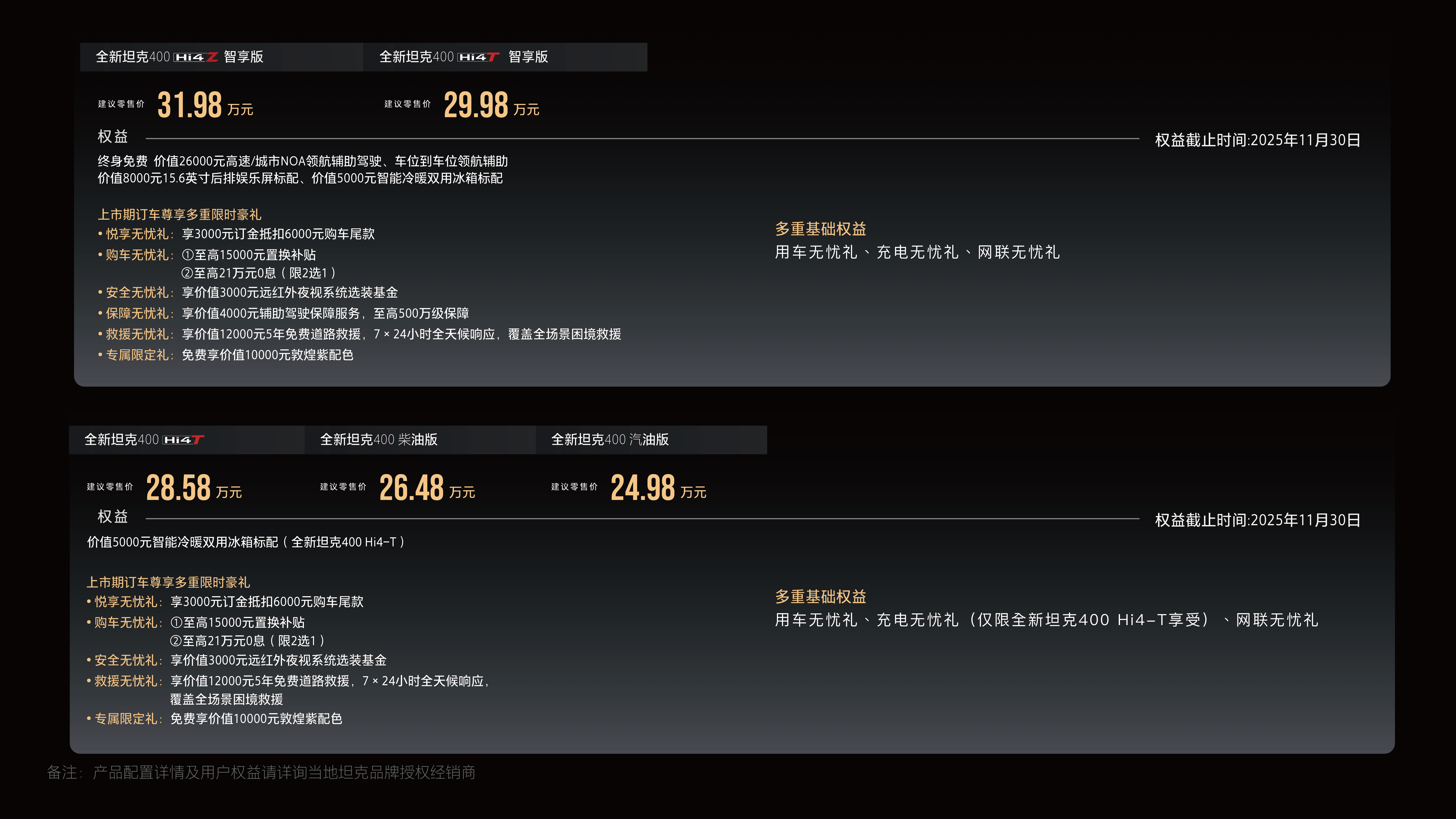 全新坦克400 Hi4-Z智享版,售價(jià)31.98萬(wàn)元;全新坦克400 Hi4-T智享版,售價(jià)29.98萬(wàn)元;全新坦克400 Hi4-T,售價(jià)28.58萬(wàn)元;全新坦克400 柴油版,售價(jià)26.48萬(wàn)元;全新坦克400 汽油版,售價(jià)24.98萬(wàn)元。即刻下單可享多重尊崇權(quán)益,坦克以滿(mǎn)滿(mǎn)誠(chéng)意為用戶(hù)帶來(lái)驚喜購(gòu)車(chē)優(yōu)惠。