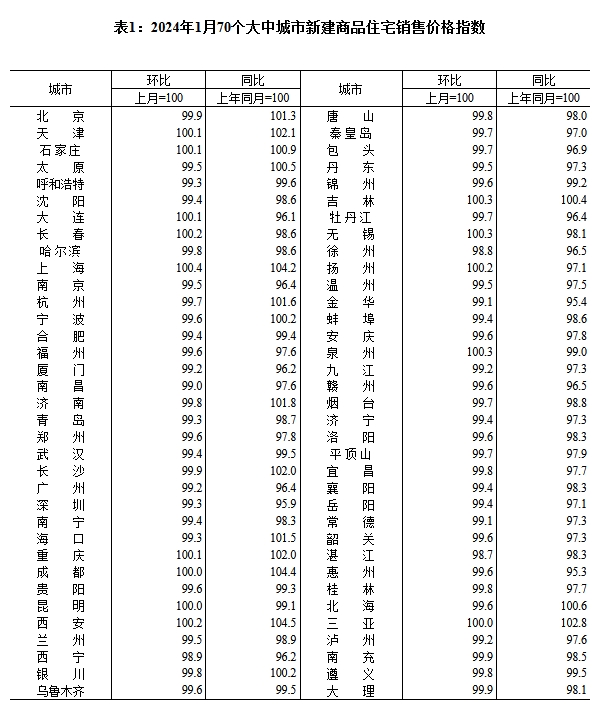 中新網(wǎng)2月23日電 國家統(tǒng)計(jì)局網(wǎng)站發(fā)布2024年1月份70個(gè)大中城市商品住宅銷售價(jià)格變動(dòng)情況。國家統(tǒng)計(jì)局城市司統(tǒng)計(jì)師王中華解讀表示,2024年1月份,70個(gè)大中城市中商品住宅銷售價(jià)格環(huán)比下降城市個(gè)數(shù)減少,商品住宅銷售價(jià)格環(huán)比降幅整體收窄、同比整體延續(xù)降勢。