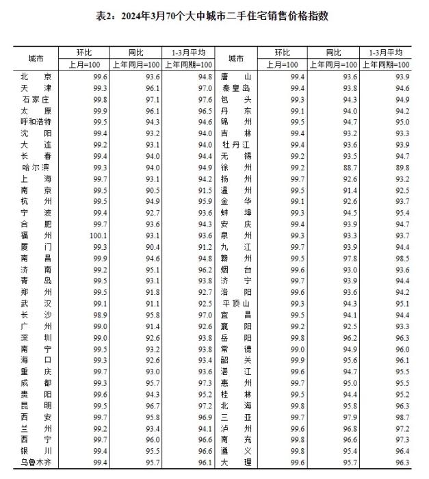 2024年3月70個(gè)大中城市二手住宅銷售價(jià)格指數(shù)。 截圖自國家統(tǒng)計(jì)局官網(wǎng)