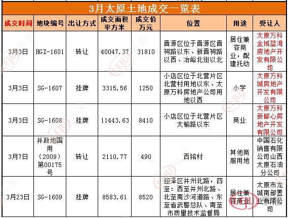 3月份,太原共5宗用地成交,除南沙河南岸一宗商住用地被太原龍城南部置業(yè)有限公司摘得以及一宗國有土地使用權(quán)轉(zhuǎn)讓以外,其余3宗均被萬科摘得,成為本月土地市場的最大看點。