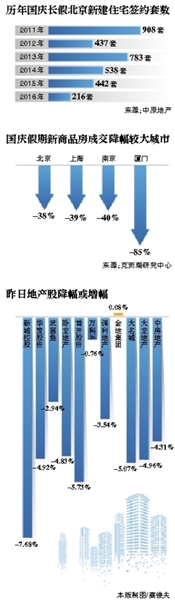 北京在9月30日出臺(tái)的政策影響了市場熱度,市場進(jìn)入了急速冷凍階段。中原地產(chǎn)研究中心統(tǒng)計(jì)數(shù)據(jù)顯示,2016年國慶長假期間,7天北京新建住宅簽約216套,二手房住宅簽約209套。合計(jì)簽約425套。而2015年國慶7天簽約為543套。從簽約數(shù)據(jù)看,北京新建住宅成交量為2011年來6年最低點(diǎn)。對(duì)此,中原地產(chǎn)首席分析師張大偉分析認(rèn)為,預(yù)計(jì)北京房價(jià)將快速降溫,四季度漲幅將明顯放緩,在自住房大量供應(yīng)后,部分區(qū)域的價(jià)格很可能出現(xiàn)調(diào)整。