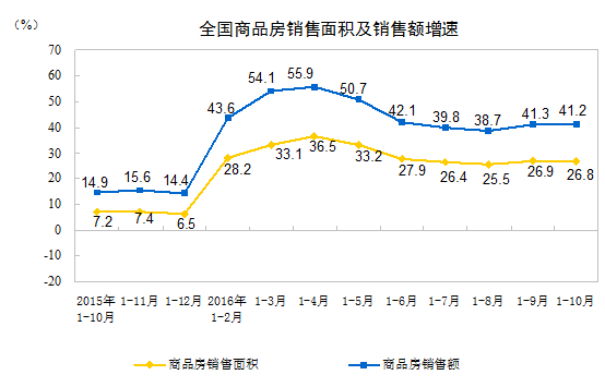 1-10月份,商品房銷售面積120338萬平方米,同比增長26.8%,增速比1-9月份回落0.1個(gè)百分點(diǎn)。其中,住宅銷售面積增長27.0%,辦公樓銷售面積增長36.1%,商業(yè)營業(yè)用房銷售面積增長19.3%。商品房銷售額91482億元,增長41.2%,增速回落0.1個(gè)百分點(diǎn)。其中,住宅銷售額增長42.6%,辦公樓銷售額增長56.5%,商業(yè)營業(yè)用房銷售額增長23.2%。