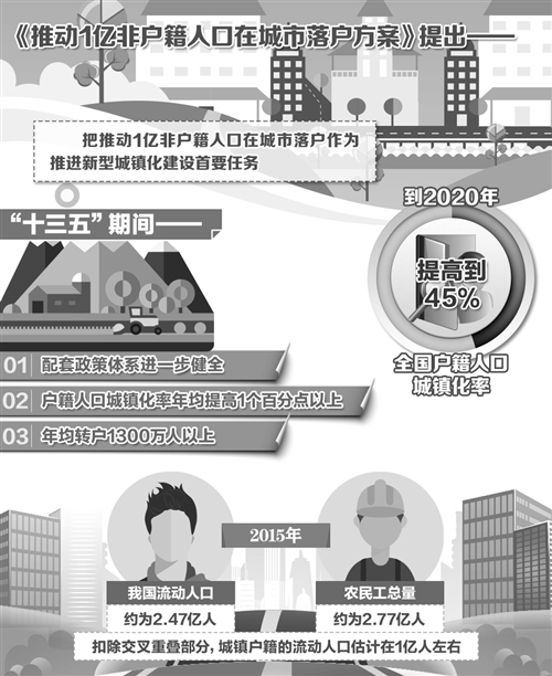 如何推動(dòng)1億左右農(nóng)業(yè)轉(zhuǎn)移人口和其他常住人口等非戶籍人口在城市落戶,使有能力在城鎮(zhèn)穩(wěn)定就業(yè)和生活的農(nóng)業(yè)轉(zhuǎn)移人口舉家進(jìn)城落戶,是我國(guó)推進(jìn)新型城鎮(zhèn)化面臨的迫切任務(wù)。不久前,國(guó)務(wù)院辦公廳印發(fā)了《推動(dòng)1億非戶籍人口在城市落戶方案》(以下簡(jiǎn)稱《方案》)。