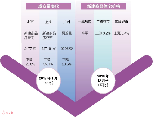 國家統(tǒng)計(jì)局70個大中城市住宅銷售價格統(tǒng)計(jì)數(shù)據(jù)顯示,2016年12月份有46座城市新建商品住宅價格環(huán)比上漲,2016年11月份為55座城市上漲,價格環(huán)比上漲的城市個數(shù)在減少。其中一線城市新建商品住宅價格環(huán)比由上月的上漲0.1%轉(zhuǎn)為持平;二線城市新建商品住宅價格上漲0.2%,比上月回落0.2個百分點(diǎn);三線城市新建商品住宅價格上漲0.4%,比上月回落0.4個百分點(diǎn)。15個一線和熱點(diǎn)二線城市因地制宜、因城施策實(shí)施調(diào)控政策以來,政策效果明顯,房價快速趨穩(wěn)回落。其中廣州市已連續(xù)三個月環(huán)比漲幅回落。