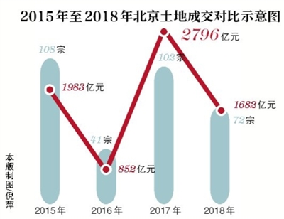 但是,進(jìn)入2018年,北京土地市場(chǎng)出現(xiàn)了較為明顯的降溫。2018年,北京共成交土地72宗,成交額1682.9億元。成交宗數(shù)及成交額同比均大幅下跌。2018年土地成交宗數(shù)同比2017年下跌29%,僅高于2016年成交水平,處于歷史低位,土地出讓金同比2017年下跌40%。