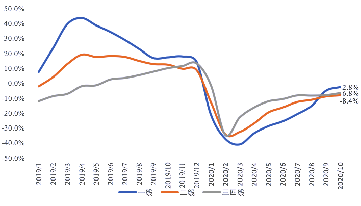 2019年至今66座大中城市中各線級(jí)城市合計(jì)月度成交套數(shù)累計(jì)同比(%) 數(shù)據(jù)來(lái)源:WIND,10月全部數(shù)據(jù)為全月預(yù)測(cè)值
