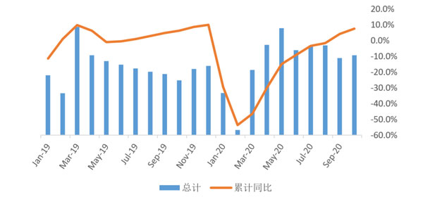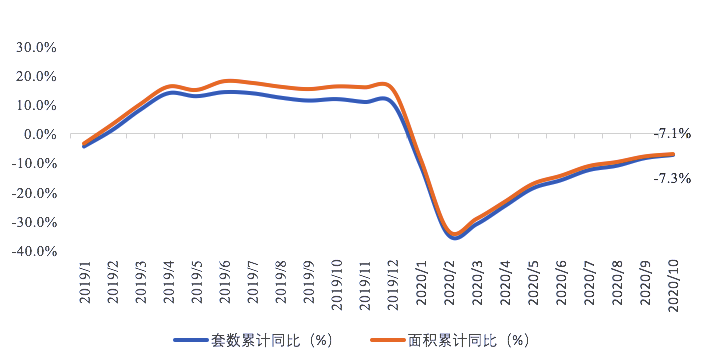 2019年至今66座大中城市合計(jì)月度成交套數(shù)與成交面積累計(jì)同比 (數(shù)據(jù)來(lái)源:WIND,10月數(shù)據(jù)為全月預(yù)測(cè)值)