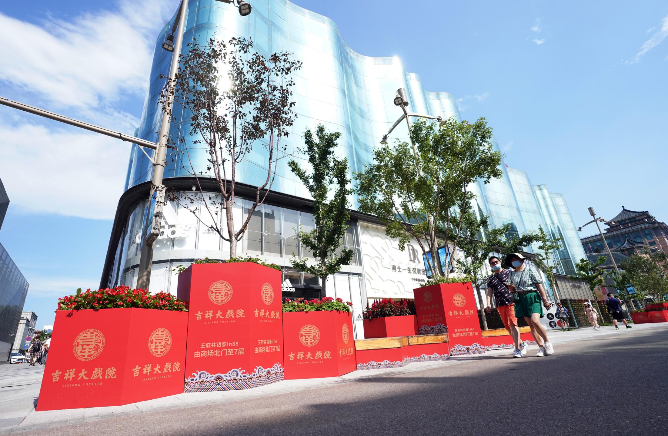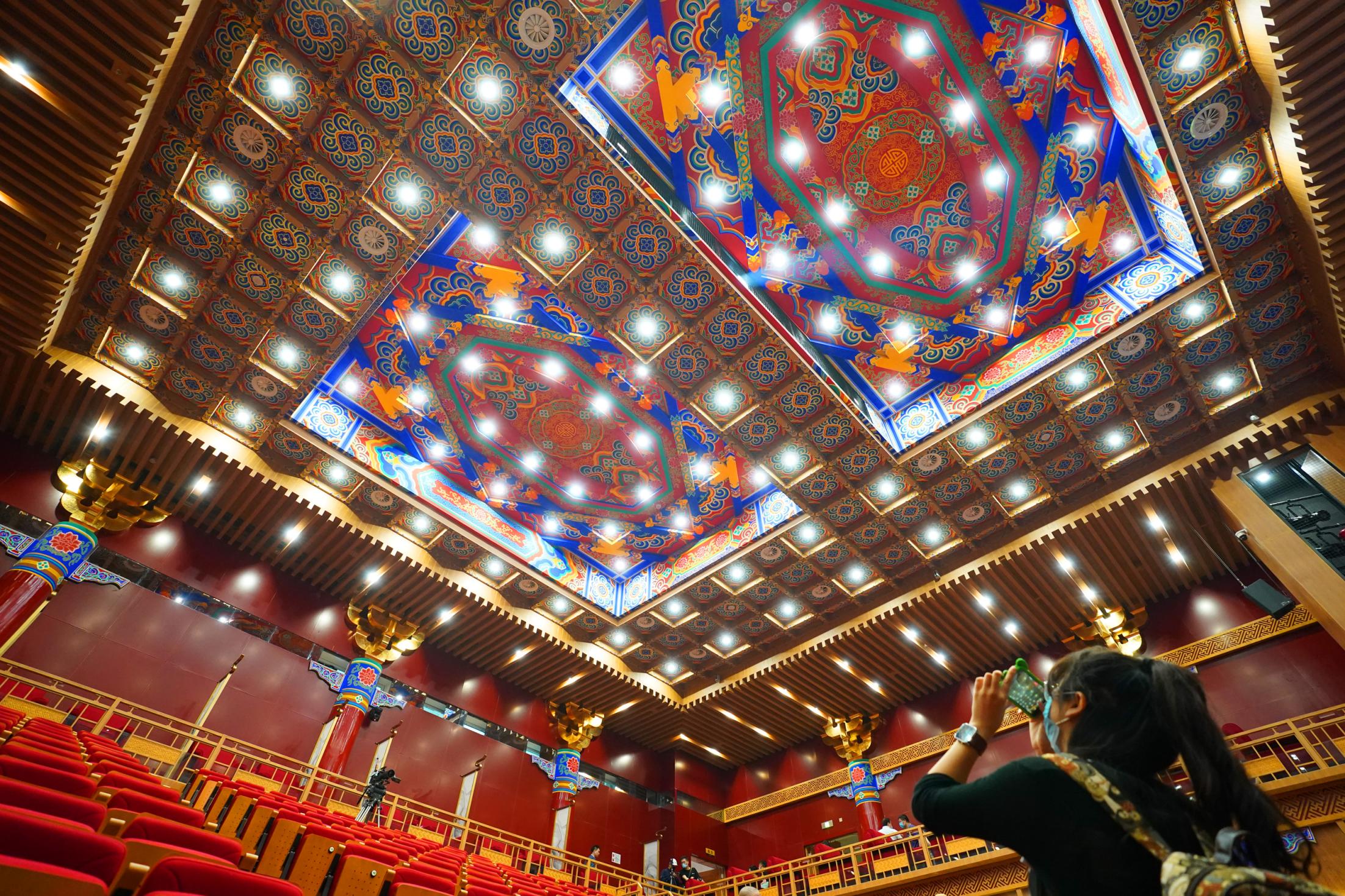 2021年7月9日,時(shí)隔28年,由北京市文化和旅游局、北京市國有資產(chǎn)經(jīng)營有限責(zé)任公司共同出資,北京京劇院、北京市演出有限責(zé)任公司共同運(yùn)營的吉祥大戲院重張啟幕。這座“藏身”于銀泰in88大廈7層、8層的空中戲院占地面積達(dá)4000平方米。乘電梯上樓,初入眼簾的前廳清新雅致,落地窗外可見王府井熙攘的人群與遠(yuǎn)處故宮、景山等古都風(fēng)光;劇場(chǎng)內(nèi),明清風(fēng)格古樸莊重,藻井彩繪繁復(fù)斑斕,傳統(tǒng)的“旋子彩繪”上增加了大量寓意吉祥的“萬字不到頭”圖案,與戲院的名字彼此呼應(yīng)。