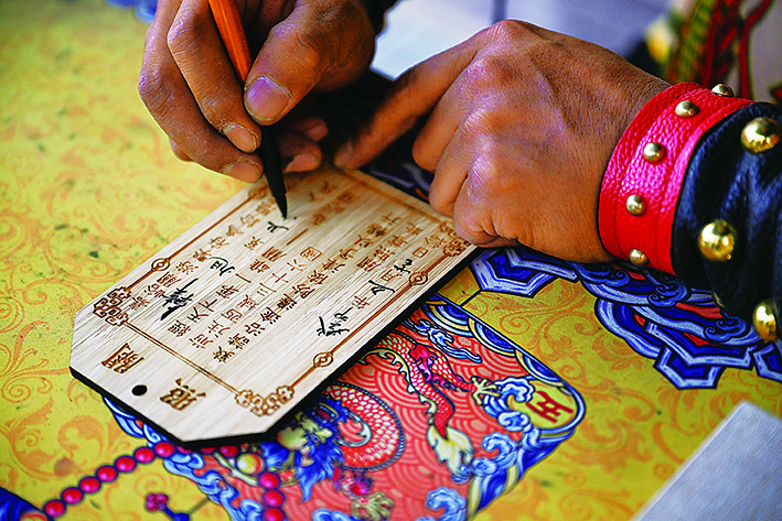 ▲李森在為游客手寫“關(guān)照”(7月14日攝)。本報記者陳鐘昊攝