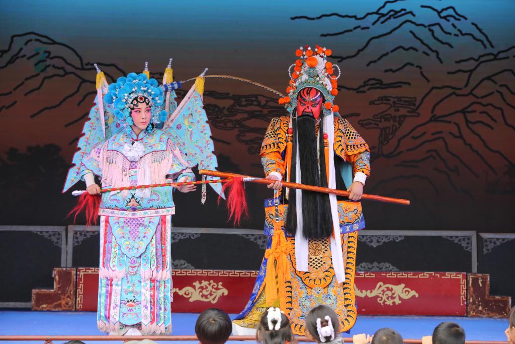 中國(guó)戲劇梅花獎(jiǎng)得主、來(lái)自寧夏秦腔劇院的國(guó)家一級(jí)演員韋小兵(右)在甘肅省定西市體育公園演唱秦腔經(jīng)典傳統(tǒng)劇《下河?xùn)|》(9月23日攝)。新華社發(fā)(王克賢攝)