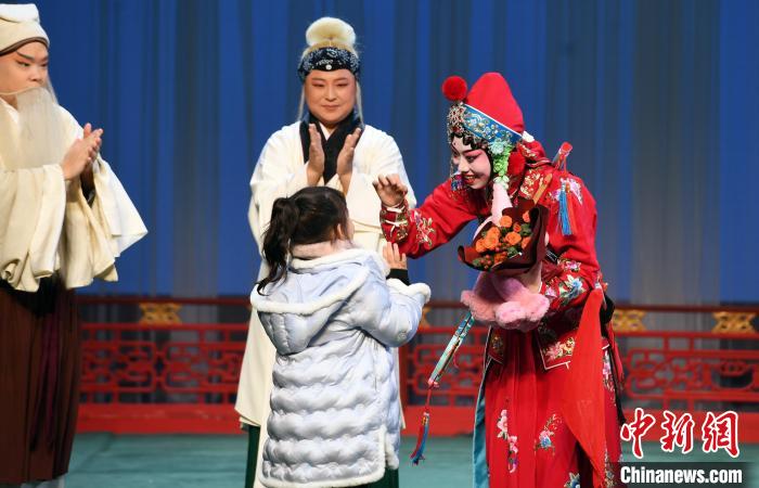 演出結(jié)束后,該劇主演劉泳渤謝幕間隙與一名走上舞臺的女童互動。 中新網(wǎng)記者劉可耕攝
