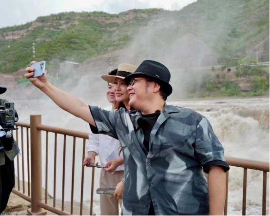 6月13日,二人轉(zhuǎn)戰(zhàn)臨汾吉縣,與同樣應(yīng)邀而來(lái)的導(dǎo)演寧浩相會(huì)于壺口瀑布,共同為家鄉(xiāng)文化代言、為山西文旅發(fā)聲。身為臨汾人,卻是第一次來(lái)到壺口瀑布,被這座有“黃河心臟”之稱的瀑布深深震撼的譚晶“秒變游客”,不停地與翻涌奔騰的黃河合影、自拍,感受家鄉(xiāng)山水的波瀾壯闊之美。