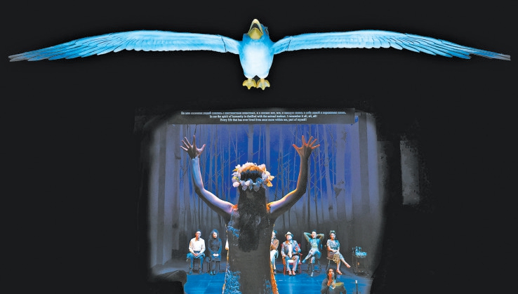 為了實(shí)現(xiàn)這一理念,劇組對舞臺進(jìn)行了大刀闊斧的改造,拆除了部分觀眾席座位,使得舞臺與觀眾席之間形成了一條真實(shí)的“路”。一只巨大的海鷗懸掛在觀眾席上方,成為連接現(xiàn)實(shí)與戲劇世界的紐帶。這種獨(dú)特的舞臺設(shè)計,讓每一位走進(jìn)劇場的觀眾可以看到一個與傳統(tǒng)鏡框舞臺截然不同的開放式空間,它打破了舞臺與觀眾席之間的界限,不僅營造出一種開放而沉浸的觀演環(huán)境,讓演員的表演更加自然流暢,也讓觀眾能夠更加近距離地感受到劇中人物的情感波動和命運(yùn)變遷。