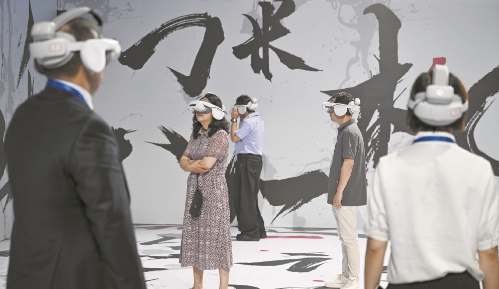 電影節(jié)的電影市場(chǎng)活動(dòng)上,嘉賓觀看中國(guó)電影科技企業(yè)的虛擬影片。 新華社發(fā)