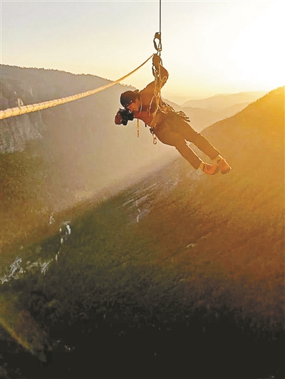 在拍攝過程中,攝制組除了動(dòng)用無人機(jī)和直升機(jī)之外,還有8名早早在巖壁各處等候拍攝亞歷克斯攀爬畫面的攝影師,在拍攝時(shí),攝影師背負(fù)幾十斤重的攝影器材和攀登裝備掛在繩索上,隨著拍攝需要快速上下繩索,需具備優(yōu)秀體能和熟練的繩索操作能力。更重要的是,他們不能打擾影響亞歷克斯。高空中的攝影師隨著亞歷克斯一起上升,有幾百米的繩索需要打理,攝影師必須讓繩索整潔地盤在身側(cè),任何失誤都可能造成致命的后果,包括不小心掉落的鏡頭蓋、不小心踢下的石頭。