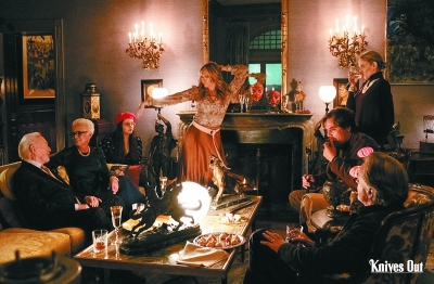 從觀感上講,《利刃出鞘》有著極其顯著的、向推理小說女王阿加莎·克里斯蒂致敬的意味。雖然電影故事發(fā)生的背景是當(dāng)下的美國,但是構(gòu)建影片的各種元素——與世隔絕的宏偉莊園、乖戾而富有的死者、貌合神離各懷鬼胎的嫌疑人、行為怪誕不按常理出牌的偵探等,以及在看似不重要的情節(jié)與臺詞中埋藏直刺真相的鋒利線索、以巧合陡峭又令人叫絕的角度起底案件等敘事方式,都與阿婆的經(jīng)典風(fēng)格十分肖似。不過,《利刃出鞘》之所以會廣受好評,除了有巧妙運用經(jīng)典推理電影范式的原因,更關(guān)鍵的也許是在于其“反經(jīng)典”的突破與創(chuàng)新。