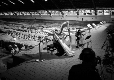 牛背梁最近陰雨連連,樂(lè)團(tuán)必須帶上雨布和雨衣;華山陡峭,得用纜車運(yùn)送樂(lè)器,山頂大風(fēng)吹得樂(lè)譜亂飛,平時(shí)在戶外固定譜子的磁條抵擋不住,只能改成橡皮筋這種“土方法”;在秦始皇陵和其他博物館里演出,燈光必須調(diào)試到國(guó)家規(guī)定的范圍內(nèi),聲音也不能超過(guò)游客最多時(shí)的嘈雜程度,選用的樂(lè)器都是柔和的弦樂(lè)和木管……