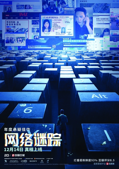 在電影中如此大規(guī)模地直接應(yīng)用文本信息,即便默片時(shí)代的間幕亦難以企及,直觀反映出電影的一次自我更新。以文本數(shù)據(jù)、程序操作為代表的機(jī)器符號(hào),帶來(lái)了新的視覺(jué)奇觀與敘事手段;時(shí)快時(shí)慢的光標(biāo)閃動(dòng)、多任務(wù)窗口的展開(kāi)與堆疊,都構(gòu)成電影場(chǎng)面調(diào)度的新形態(tài)。屏棲蒙太奇的美學(xué)特征由此建立于大眾的數(shù)字生活經(jīng)驗(yàn)之上,通過(guò)各類數(shù)據(jù)的組織、匯聚與碰撞,產(chǎn)生戲劇性意義,這亦是后媒體時(shí)代電子藝術(shù)的共通之處。