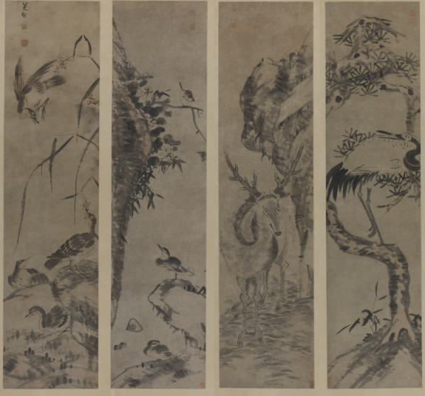 八大山人朱耷創(chuàng)作《鶴鹿鳧雁圖》每軸獨(dú)立成像,分別描繪了鶴、鹿、鳧、雁。從署款“八”呈兩點(diǎn),并改“畫”為“寫”來看,應(yīng)是其70歲之后的佳作。屏中每個形象均作“白眼”狀,彼此間還似乎相互顧盼。白眼是一種孤高、孤傲的自我表達(dá)。但八大山人對世事的孤冷與不屑,也建立在他對世界充滿童真和天趣的藝術(shù)人文溫度。歷經(jīng)人生坎坷的他最后歸于平和,既嚴(yán)肅、又幽默地表達(dá)自己的情感。