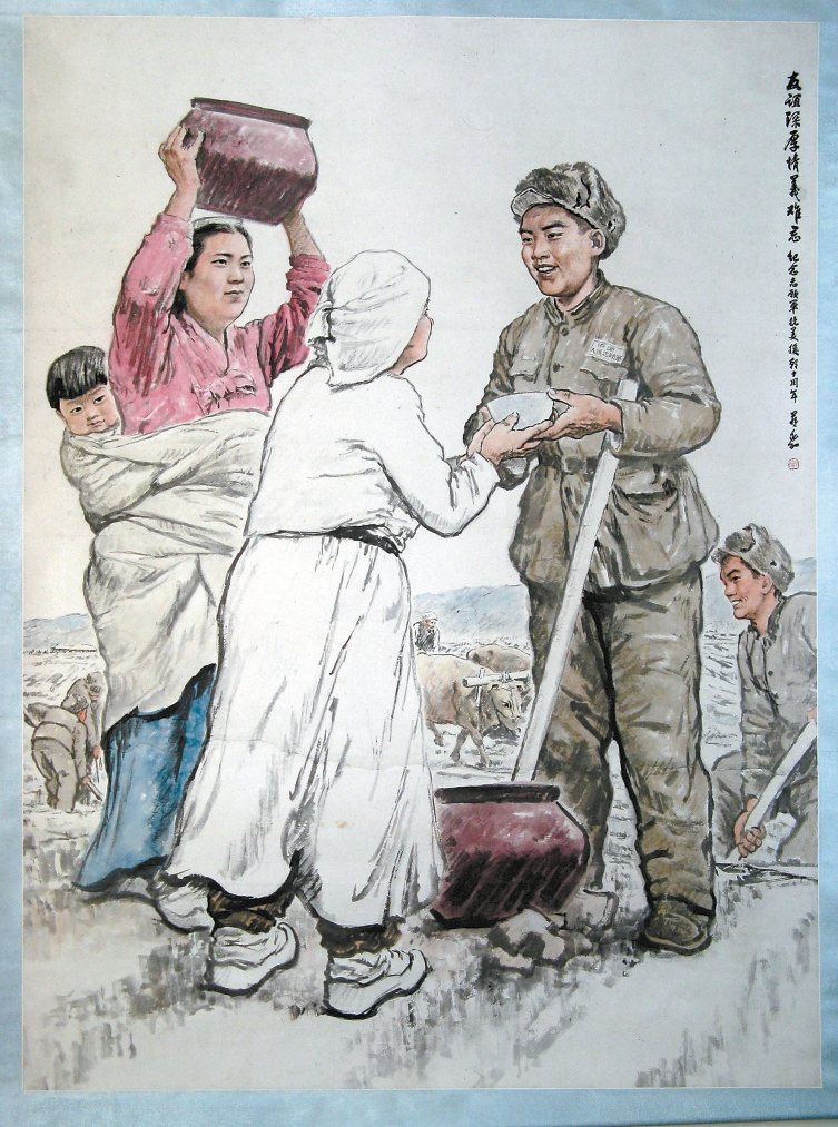 ??在展廳里,有一幅蔣兆和創(chuàng)作的中國畫《友誼深厚情義難忘》,畫中的“紀念志愿軍抗美援朝十周年”題跋道出了其創(chuàng)作的時間。畫面的主體是兩位朝鮮婦女正為志愿軍戰(zhàn)士送水,其中一位婦女還背著可愛的幼兒。在幾位主要人物的身后,畫家細致地描繪了志愿軍戰(zhàn)士們在農(nóng)田幫助朝鮮人民恢復(fù)農(nóng)業(yè)生產(chǎn)的場景。在中朝軍隊打退以美國為首的“聯(lián)合國軍”、朝鮮停戰(zhàn)協(xié)定簽訂后,志愿軍在鞏固防守的同時,還幫助朝鮮人民建設(shè)新家園,與朝鮮人民結(jié)下了深厚情誼。