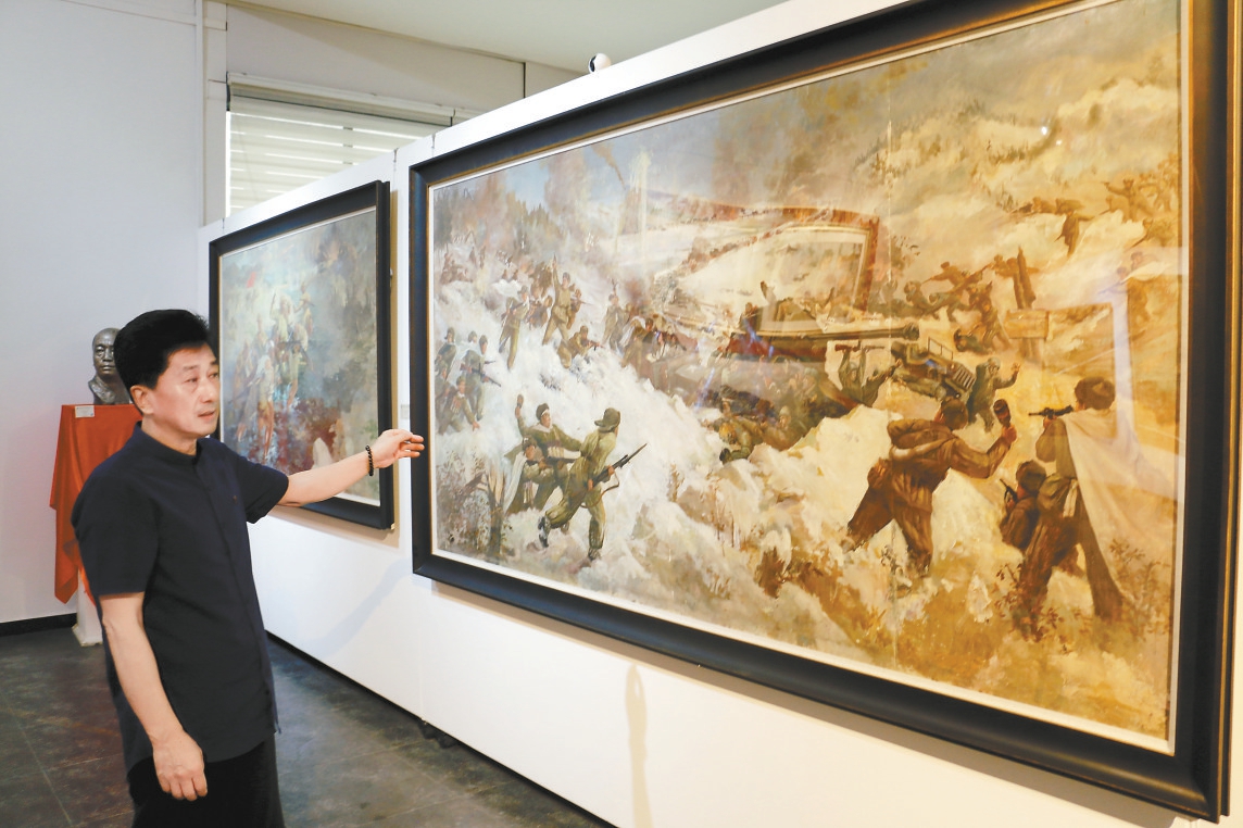 ??“1951年,畫家伍必端以戰(zhàn)地記者身份到朝鮮前線采訪,創(chuàng)作多幅戰(zhàn)地速寫,這幅作品是他創(chuàng)作的油畫《中朝部隊并肩作戰(zhàn)打擊美國狼》?!背r萬壽臺創(chuàng)作社美術(shù)館館長吉正太介紹,這幅畫表現(xiàn)的是上甘嶺戰(zhàn)役中激烈的戰(zhàn)斗場景,冬日的戰(zhàn)場上覆蓋著白雪,空中硝煙彌漫,中國人民志愿軍和朝鮮人民軍的戰(zhàn)士們正抗擊侵略者,有的在扔手榴彈,有的在沖鋒,還有的與侵略者近身搏斗……身處前線的伍必端用畫筆記錄下最可愛的人,展現(xiàn)出一位人民藝術(shù)家對革命事業(yè)的一腔赤誠。
