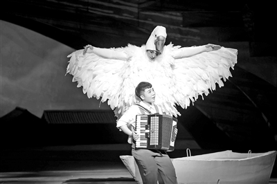 最具情趣的莫過于由北京京劇院武丑演員曹陽陽帶領(lǐng)一眾北戲?qū)W生演出的大鵝,身披潔白羽毛憨態(tài)可掬。這也是曹陽陽從藝以來第一次在舞臺上以動物的形態(tài)進(jìn)行表演。這個與主角林大林互動最多的角色,既要化身林大林渴望的父愛,又是他孤單時的玩伴。在模仿大鵝走路的過程中,曹陽陽便用上了京劇武丑的技巧。其中一場水中救人的段落,他甚至還要從兩米多高的橋上展開翅膀飛身下去,對京劇下高、空翻技巧有了全新的展示。