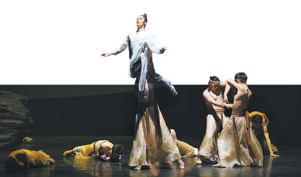 《九歌》劇照,圖為張翰飾演的河伯被群舞演員托舉而起。