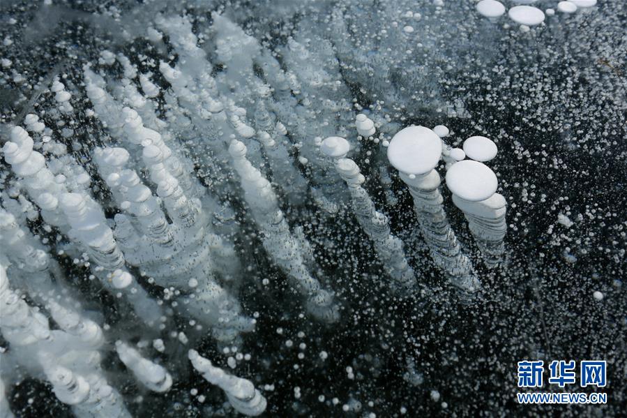 2月20日在新疆博爾塔拉蒙古自治州境內(nèi)的賽里木湖拍攝的湖面結(jié)冰后形成的冰花奇觀。進(jìn)入2月份后,新疆海拔最高的湖泊賽里木湖湖面全部結(jié)冰,在湖邊的一些小泉眼處,不停泛出的氣泡在冷空氣作用下,迅速凝結(jié),形成了如冰柱、螺旋紋等形式多樣的冰花奇觀,令人嘆為觀止。新華社發(fā)(沈志君 攝)