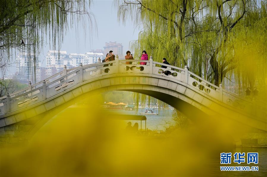 3月17日,山東濟(jì)南大明湖畔楊柳吐翠,杏花飄香,市民踏春游湖盡享明媚春光。 新華社記者 郭緒雷 攝