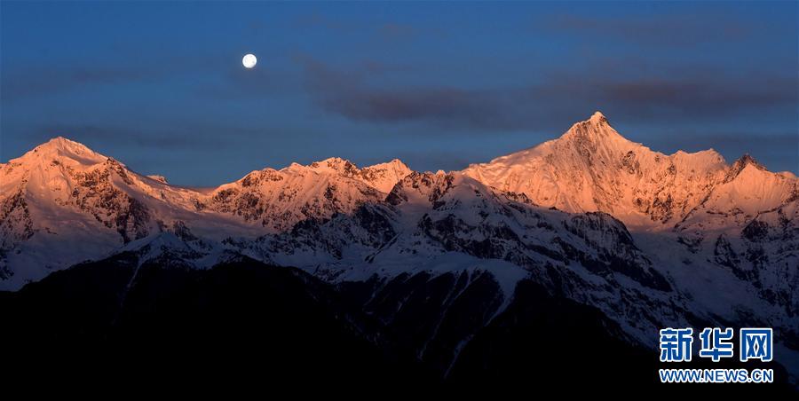 這是3月25日清晨拍攝的梅里雪山“日月同輝”景觀。梅里雪山位于滇藏交界的云南省迪慶藏族自治州德欽縣境內,是世界自然遺產“三江并流”的主要自然景觀之一。梅里雪山常年云霧籠罩,太陽光只在少數天晴的清晨照射在雪山頂上,形成絕美的“日照金山”美景。有時月亮尚未落山,太陽已經升起,更是形成了難得一見的梅里雪山“日月同輝”奇觀。新華社記者 王長山 攝
