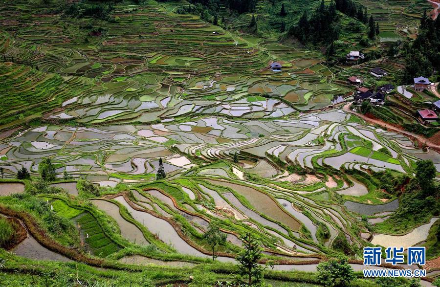 5月20日在廣西柳州市融水苗族自治縣桿洞鄉(xiāng)拍攝的梯田。廣西柳州市融水苗族自治縣桿洞鄉(xiāng)平均海拔780多米,是全縣高海拔鄉(xiāng)鎮(zhèn)之一。這里的梯田多在高山,人們稱(chēng)之為“天上糧倉(cāng)”。時(shí)下,“天上糧倉(cāng)”或儲(chǔ)水待插,或新秧初栽,如織錦一般美不勝收。新華社發(fā)(龍濤 攝)