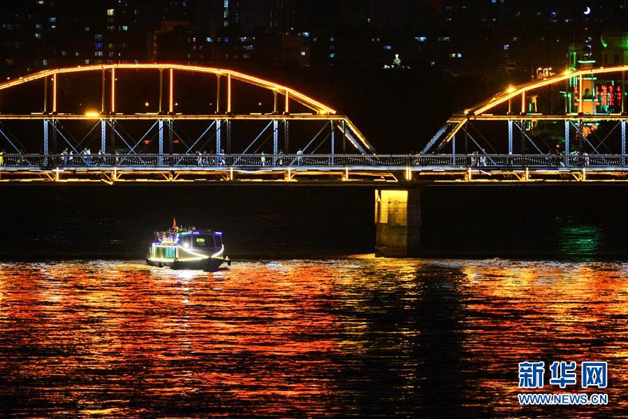 6月14日,一艘游輪從黃河蘭州段中山橋下穿過。自6月12日起,蘭州黃河游輪夏季夜航航線正式開通。據(jù)了解,作為黃河蘭州段水上旅游重點線路,該航線由蘭州市城關區(qū)蘭州港碼頭和白塔山碼頭始發(fā),每晚20時起開行,全程約6公里,運行時長50分鐘左右。游客可以乘坐豪華游輪欣賞黃河夜景,感受蘭州黃河風情線別樣魅力。新華社記者 陳斌 攝