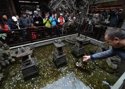 中午時分,記者又一次仔細觀察了水池,在游人拋投硬幣時,確實有一兩條金色的觀賞魚在石縫處游動著。在木制欄桿四周,正貼著“禁止倚靠欄桿”、“禁止投幣”等字樣?!按汗?jié)游客爆滿,水池是從寬巷子到窄巷子的必經(jīng)之道,加上很多人在拋硬幣,頓時人滿為患。我們只好打印了幾張?zhí)嵝褟堎N起來。”辦公室工作人員還表示,“等春節(jié)游客潮稍微退卻,天氣回暖,我們就要派人下水打撈這些硬幣,用于景點建設?!?/p>