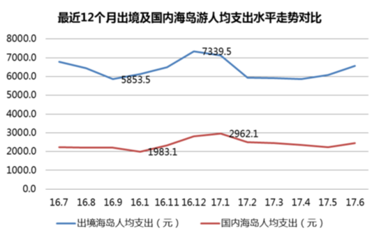 《報告》提供的同程旅游海島游消費數(shù)據(jù)顯示,最近一年(2016年7月至2017年6月)出境海島游消費人群用于購買旅游產(chǎn)品(線路、交通、住宿等,不含購物消費)的人均支出為6340.6元,國內(nèi)海島游人均支出為2368.9元。從時間軸來看,出境海島游和國內(nèi)海島游的人均支出水平明顯與出游客流的季節(jié)呈現(xiàn)出同步變化趨勢,出境海島游旺季人均支出最高可達(dá)7339.5元,國內(nèi)海島游旺季人均支出最高可達(dá)2962.1元。