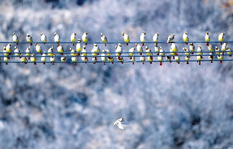 從去年10月下旬開始,有大量的小太平鳥進入沁源縣境內(nèi),主要棲息在靈空山自然保護區(qū)、菩提山森林公園等地,到今年2月下旬,鳥群逐漸增多。本周以來,已有近萬只小太平鳥棲息于沁源縣境內(nèi),場面頗為壯觀,為綠色沁源又增添了一道亮麗的風景。圖為3月28日沁源縣境內(nèi)拍攝的一群小太平鳥。