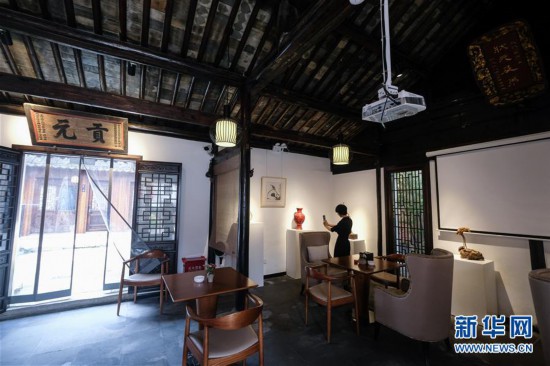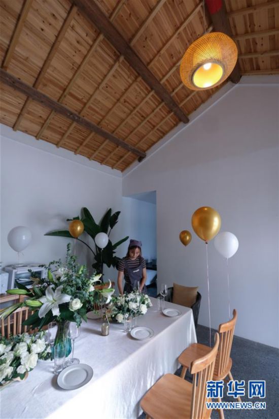 5月28日,湖州市織里鎮(zhèn)廟兜村“三葉屋”民宿工作人員在整理客廳。該民宿由舊屋改造而成,集餐飲、書屋、住宿于一體。 新華社記者 徐昱 攝