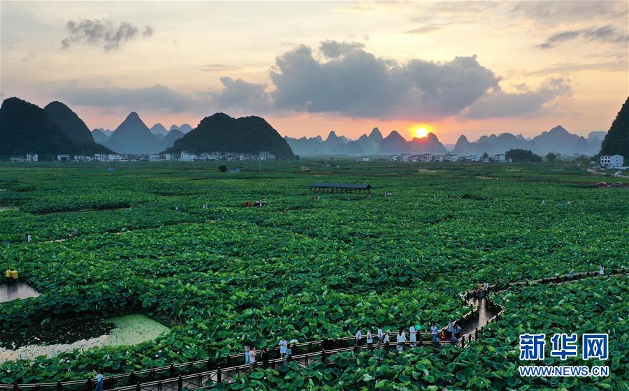 6月28日,游客在廣西柳州市柳江區(qū)百朋鎮(zhèn)萬畝荷塘里游玩。新華社發(fā)(黎寒池 攝)