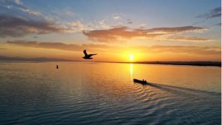 立秋過(guò)后,新疆博斯騰湖上漁民秋捕繁忙。位于新疆巴音郭楞蒙古自治州博湖縣境內(nèi)的博斯騰湖是我國(guó)最大的內(nèi)陸淡水湖,也是新疆最大的漁業(yè)生產(chǎn)基地。博斯騰湖年產(chǎn)草魚(yú)、鰱魚(yú)、鯉魚(yú)等32種魚(yú)類約4000噸。圖為8月8日,在新疆博斯騰湖,漁民駕駛漁船前往捕撈區(qū)域(無(wú)人機(jī)照片)。新華社發(fā) 年磊 攝