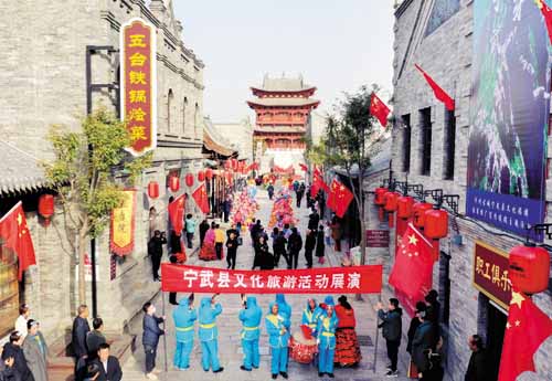 ——民俗文藝巡演“聚人氣”,引燃主題活動(dòng)。鑼鼓聲陣陣響起,宣傳月款款而來。寧武縣文體中心把舞獅、旱船、民歌、晉劇、小秧歌、二人臺(tái)、廣場(chǎng)舞、北路梆子、旗袍走秀等具有寧武地方韻味的節(jié)目搬到忻州古城南北大街、泰山廟和關(guān)帝廟活動(dòng)現(xiàn)場(chǎng),輪番上演,傾情打造了一場(chǎng)熱鬧溫馨、雅俗共賞的旅游盛宴,吸引市民和游客駐足圍觀。 “我從頭到尾觀看他們的歌舞表演,對(duì)寧武及這個(gè)地方的文藝有了了解,有機(jī)會(huì)我一定去寧武親身感受一番?!眮碜蕴挠慰颓爻x有感而發(fā)。