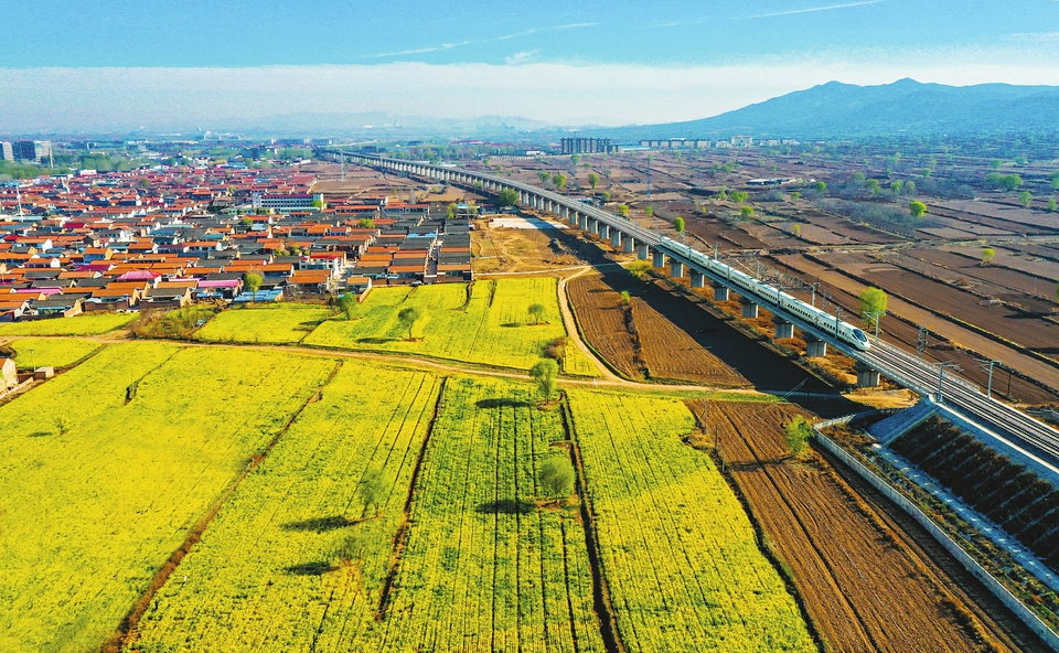 4月9日,長治市潞州區(qū)南垂村,金燦燦的油菜花海與村落、高鐵列車交織成一幅鄉(xiāng)村振興的田園畫卷,美不勝收。張海 張永清攝