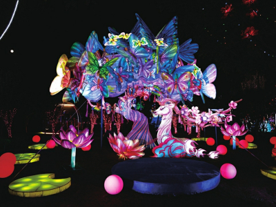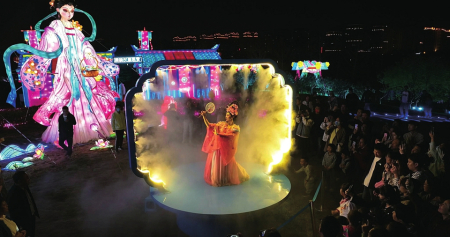 在百花的傳說中,十二月令花神的傳說最令人神往。在桃花島上,梅花、杏花、桃花、牡丹、石榴、蓮花、蜀葵、桂花、菊花、木芙蓉、山茶、水仙,各路花神身著華服,在所屬花燈前翩翩起舞,燈光人影交織,盡顯浪漫。“十二花神”每晚分時段在桃花云臺,跳起如云似幻的祈福舞,笑容明媚,面若桃紅,傾倒眾人。無人機組集合成孔明燈形狀,載著每個人最虔誠的心愿緩緩升空?!笆ㄉ瘛彪S即走下“神臺”,出沒在各個角落,讓整個桃花島亦真亦幻。穿行其中,與“花神”擦肩而過,仿佛穿越時空,進入神話世界。